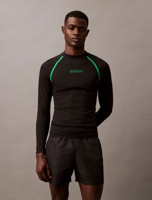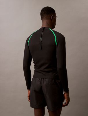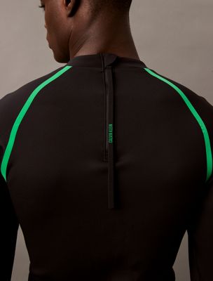 This rash guard is made with 60% recycled nylon fabric, created by reprocessing existing materials.